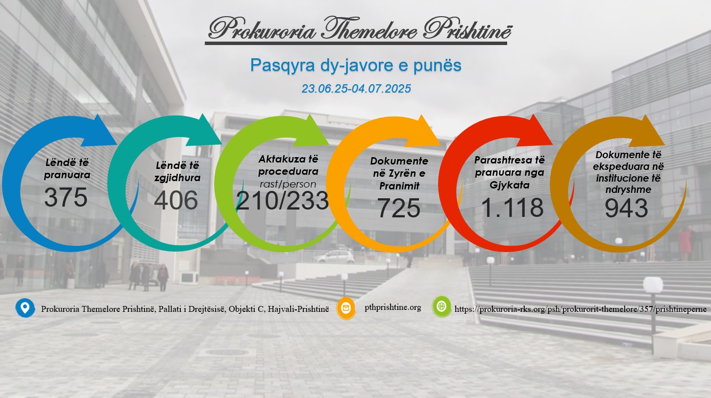 “Prokuroria Themelore në Prishtinë, në periudhën 23/06/2025-04/07/25 ka pranuar 375 lëndë, ndërsa ka zgjidhur gjithsejtë 406 lëndë. Në kuadër të numrit të përgjithshëm të lëndëve të zgjidhura, Prokuroria Themelore në Prishtinë për këtë periudhë kohore ka ngritur 210 aktakuza kundër 223 personave”, thuhet në njoftim.