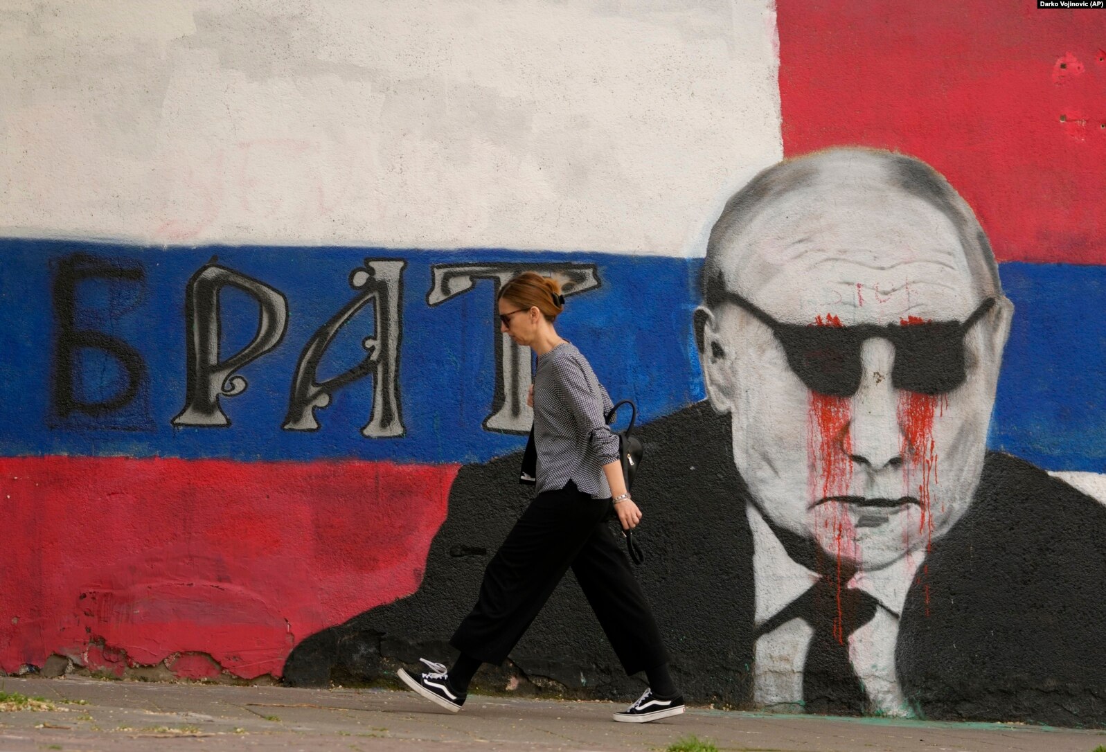 Një grua duke kaluar pranë një murali të presidentit rus, Vladimir Putin. Në muralin që pastaj është lyer me ngjyrë, shkruan “Vëllai”. Beograd, 7 maj 2022.