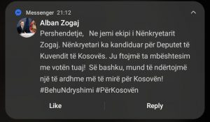 Kjo i ka ndodhur një qytetari, të cilit i ka ardhur një kërkesë për mbështetjen e nënkryetarit të Prishtinës, Alban Zogaj, i cili garon për deputet me Lidhjen Demokratike të Kosovës.