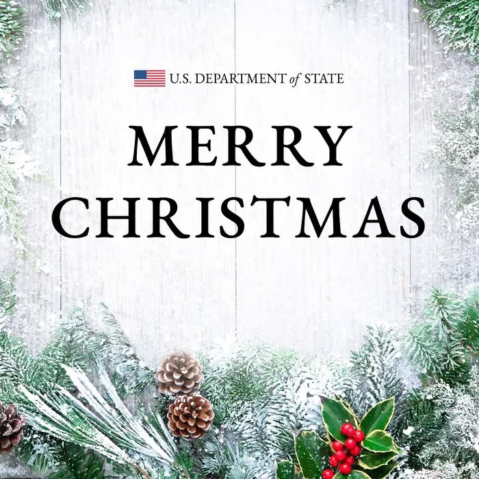 Mund të jetë një imazh i Pema e Krishtlindjes dhe teksti që thotë "U.S. DEPARTMENT of STATE MERRY CHRISTMAS"