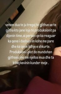 “Këto janë lojëra të produksionit që u bënë pa dijeninë time. Ai ka qenë i dashuri im kohë më parë dhe ka qenë lidhje e shkurtër. Produksioni po më njollos mua dhe ta kthej Kevinin kundër meje”, shkroi ajo.