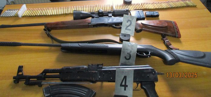 “Gjatë kontrollit janë gjetur dhe konfiskuar në cilësi të provave materiale: Një (1) armë e gjatë AK 47 me një karikator e kalibrit 7.62×39 mm, një pushkë gjahu kalibrit e markës Remington e kalibrit 280 rem, njëqind e dhjetë (110) fishekë të kalibrit 280 rem dhe një (1) pushkë ajrore”, thuhet në njoftim.