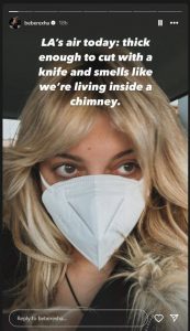 “Ajri i LA sot: I trashë sa të pritet me thikë dhe mban erë sikur jetojmë brenda një oxhaku,” shkroi 35-vjeçarja, duke e shoqëruar mesazhin me një fotografi ku shfaqej me maskë, një masë e domosdoshme për t’u mbrojtur nga ndotja e ajrit.
