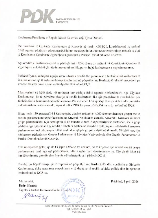 Përmes kësaj letre, Hamza ka theksuar se vendimi i Gjykatës Kushtetuese të Kosovës në rastin KO81/26 ka sqaruar përfundimisht çdo paqartësi lidhur me këtë çështje. Sipas tij, ky aktgjykim konfirmon se përfaqësimi i PDK-së me dy anëtarë në KQZ është një e drejtë kushtetuese dhe jo çështje interpretimi politik.