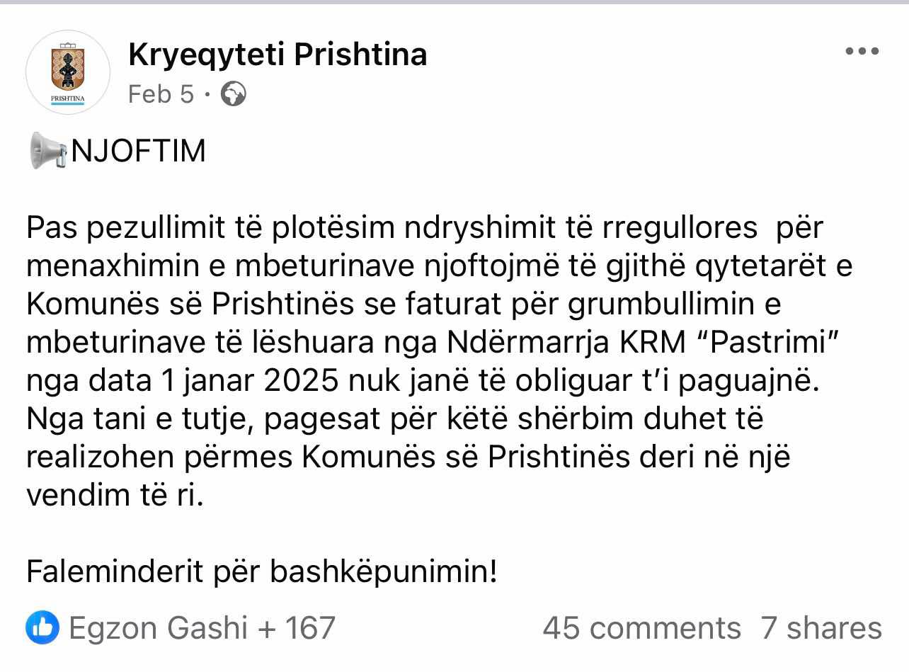 Më 5 shkurt 2025, Komuna publikoi një njoftim zyrtar në faqen e saj në Facebook, ku thuhet qartë se qytetarët nuk janë të obliguar të paguajnë faturat për grumbullimin e mbeturinave të lëshuara nga Ndërmarrja KRM “Pastrimi” nga data 1 janar 2025. Sipas këtij njoftimi, të gjitha pagesat për këtë shërbim duhet të kalojnë përmes Komunës deri në një vendim të ri.