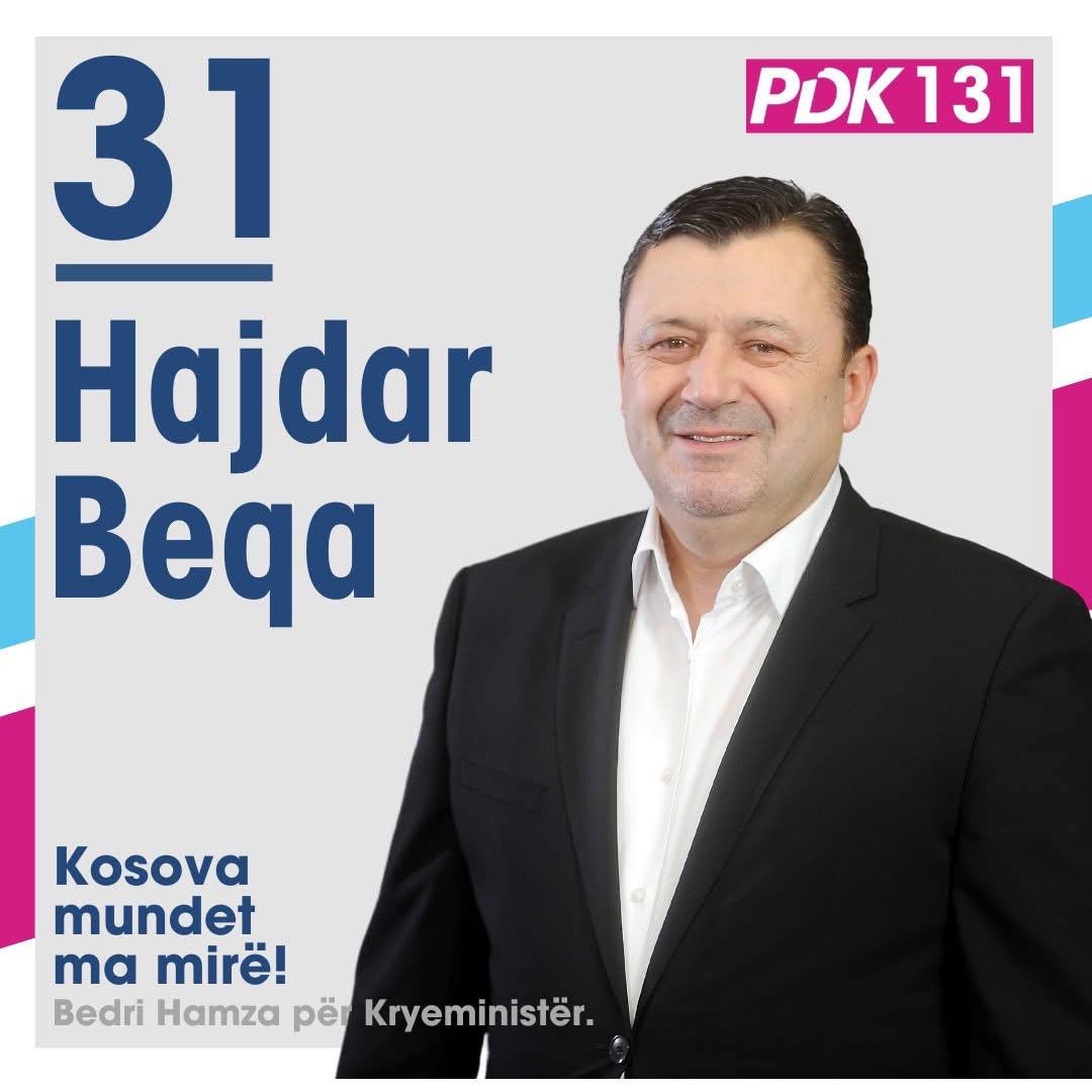 Hajdar Beqa, i cili garon me numrin 31 në listën e PDK-së, është një figurë kyçe në këtë fushatë. Si kryetar i degës së PDK-së në Gjakovë dhe një nga deputetët më aktivë në Kuvendin e Kosovës, ai ka luajtur një rol të rëndësishëm në drejtimin e komisioneve hetimore parlamentare për rastet më të bujshme, si skandali me KEK-un dhe ai me rezervat shtetërore nën menaxhimin e qeverisë Kurti, po ashtu njihet edhe si deputeti i “syzeve të Hekuran Muratit”, ministrit të Financave kur ky i fundit e kishte sulmuar kolegun e z.Beqa, Mergim Lushtakun, gjatë një aksioni simbolik në Kuvendin e Kosovës.