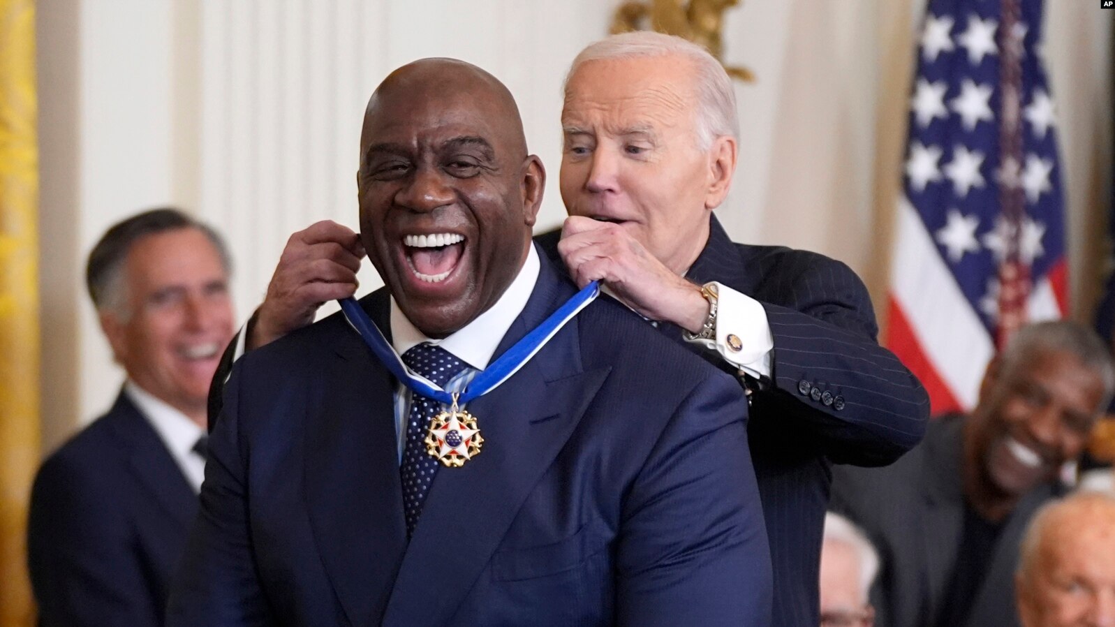 Presidenti Biden duke i dhënë medaljen ish-basketbollistit “Magic” Johnson