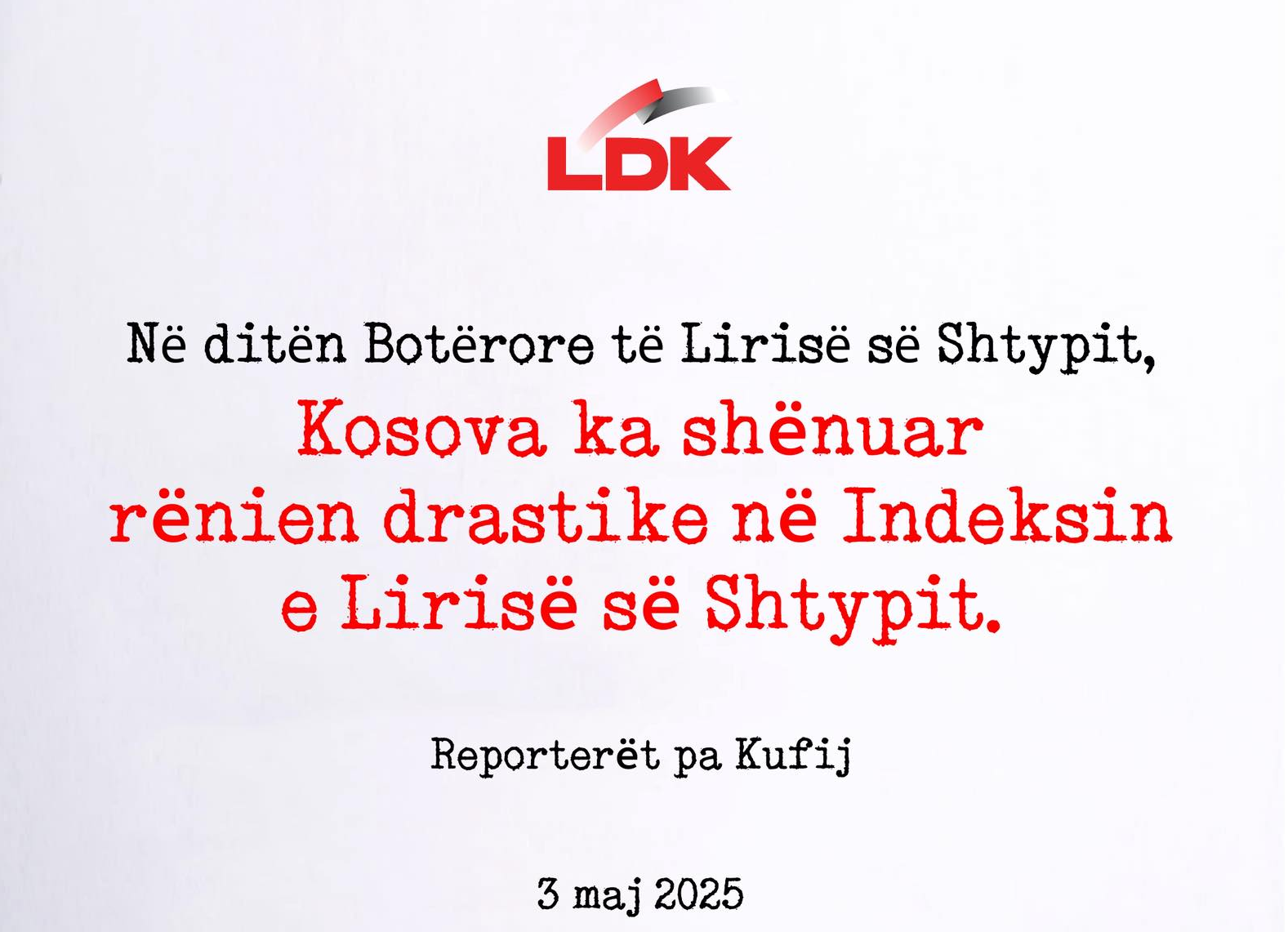 ‘‘Dita Botërore e Lirisë së Shtypit, e gjen Kosovën me rezultat jashtëzakonisht shqetësues, sa i përket lirisë së medias- pushtetit të katërt. Kosova, sipas Indeksit të Lirisë së Shtypit nga Reporterët pa Kufij(RSF), ka shënuar rënien më të madhe në 15 vitet e fundit të saj, duke u renditur në pozitën e 99-të nga 180 vende të vlerësuara, më së keqi në gjithë rajonin, një tregues alarmant i përkeqësimit të mjedisit mediatik në vend. Viti 2025 është viti i dytë radhazi që Kosova pëson rënie në këtë indeks, nga vendi i 56-të në vitin 2023, në vendin e 75-të në vitin 2024, përderisa në këtë vit shënoi regresin më të madh, duke u ranguar në vendin e 99-të. Prandaj, raportet e tilla janë dëshmi e qartë e përkeqësimit sistematik të gjendjes së lirisë së medias’’, thuhet mes tjerash në komunikatën e LDK-së.