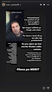 Në një postim në InstaStory, ai ka ndarë një fotografi të banorit Edi, duke shprehur mbështetje për ndjenjat e tij të zhgënjimit ndaj fituesit të spektaklit, Drilonit.