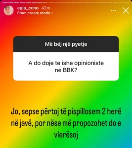 Në një postim në rrjetet sociale, Egla Ceno u pyet nëse do të dëshironte të ishte opinioniste në spektaklin “Big Brother Vip Albania”.