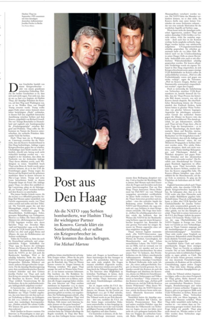 Gazetari i gazetës gjermane “Frankfurter Allgemeine Zeitung”, Michael Martens, ka ndarë detaje rreth intervistës që ai ka zhvilluar me ish-presidentin e Kosovës, Hashim Thaçin, në Hagë.