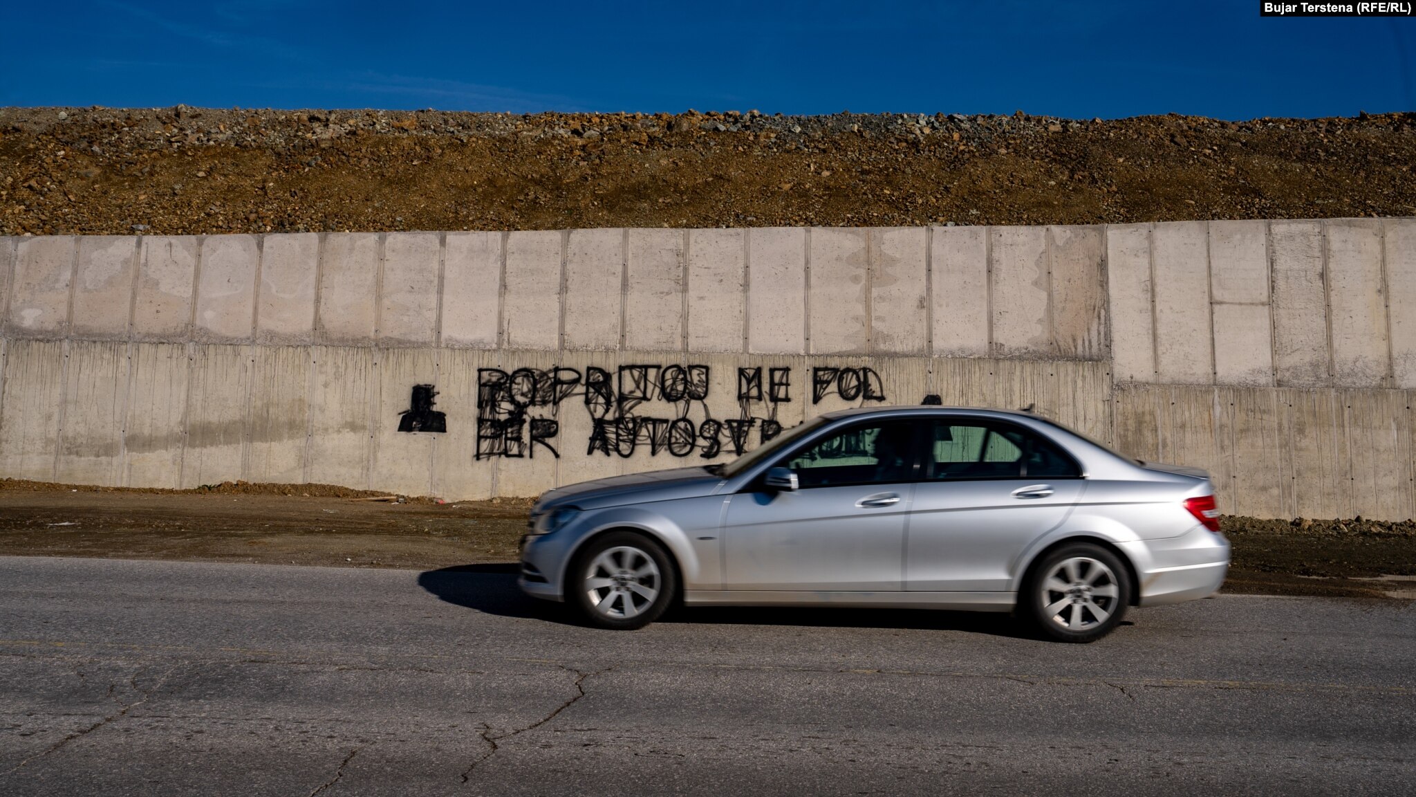 Partia Socialdemokrate ka vendosur mbishkrimin “Po pritoj me folë për autostradë” duke iu refuar ministrit të Infrastrukturës, Liburn Aliu. Ky mbishkrim pastaj është mbuluar.