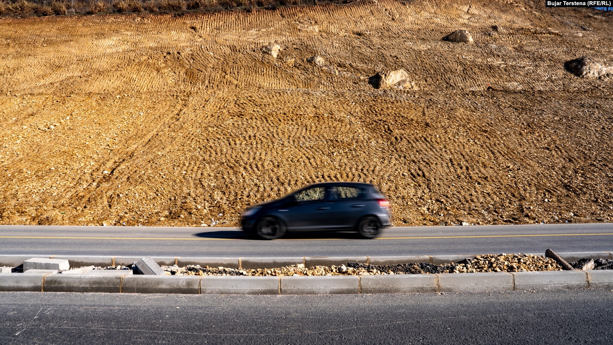 Asfalti i përfunduar, por jo edhe mbrojtëset në shpate, nga rrëshqitjet eventuale të dheut.