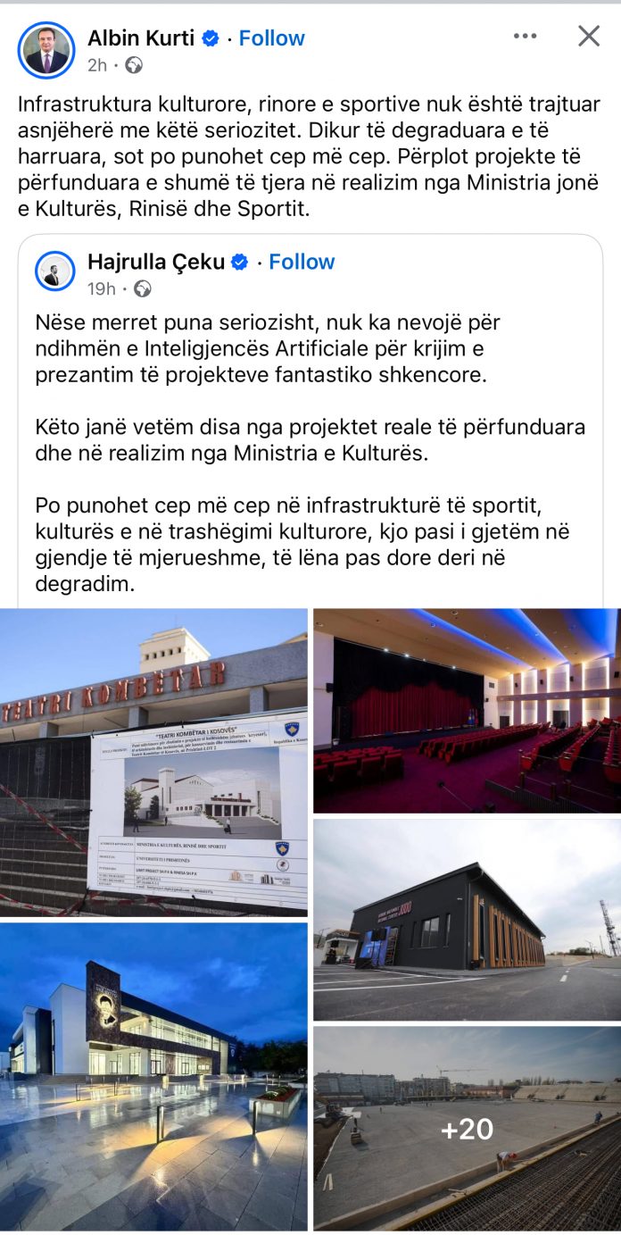 storm•/Zgjedhjet 2025: Në kohën kur Kosova përballet me sfida të mëdha dhe pakënaqësi të qytetarëve, qeveria ka nisur një valë propagande elektorale, duke i shitur si suksese projekte që as nuk janë ideuar dhe as përfunduar gjatë mandatit të tyre. Postimi i ministrit të Kulturës, Hajrulla Çeku, i mbushur me foto të projekteve infrastrukturore, është ripostuar nga kryeministri Albin Kurti për të përfituar nga audienca e tij më e gjerë në rrjete sociale.