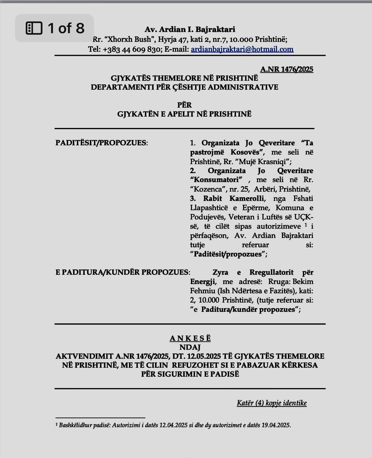 “Me gjithë refuzimin nga ana e Gjykatës Themelore, ne mbetemi të vendosur në rrugën tonë ligjore. Vendimi i ZRrE-së për ngritjen e çmimit të energjisë ka pasoja të drejtpërdrejta mbi mijëra qytetarë dhe biznese në Kosovë, dhe ne besojmë fuqishëm se ai është jo vetëm i padrejtë, por edhe i paligjshëm në disa aspekte. Ankesa për Gjykatën e Apelit është pothuajse gati dhe do të dorëzohet së shpejti”, deklaroi avokati.