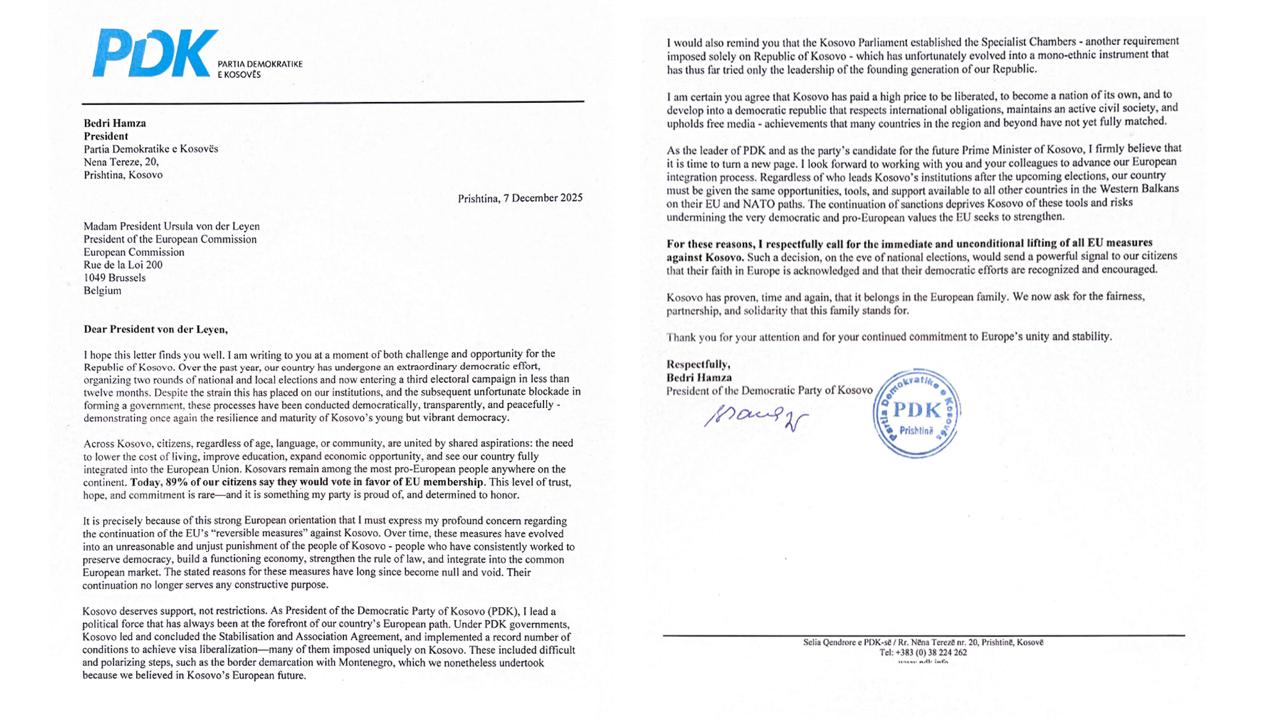 Si kryetar i Partisë Demokratike të Kosovës (PDK) dhe kandidat për kryeministër, Bedri Hamza i është drejtuar me letër Presidentes së Komisionit Evropian, Ursula von der Leyen, duke kërkuar heqjen e menjëhershme dhe të pakushtëzuar të masave të BE-së ndaj Kosovës.
