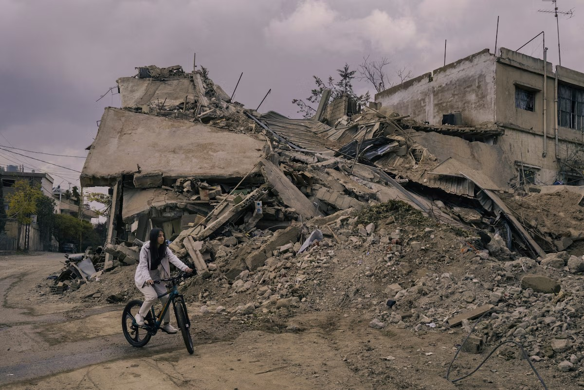 Aya nget biçikletën e saj pranë vendit të një sulmi ajror izraelit në qytetin Baalbek, Liban, më 2 nëntor. (Lorenzo Tugnoli për The Washington Post)