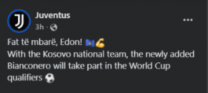 Në një postim në rrjetet sociale, “Zonja e Vjetër” ka shkruar: “Fat të mbarë, Edon! 🇽🇰💪 Me Kombëtaren e Kosovës, Bianconero i sapo shtuar do të marrë pjesë në kualifikimet për Kupën e Botës ⚽.”