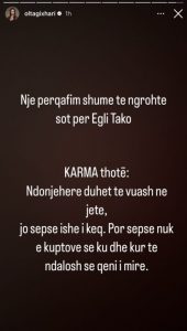 “Një përqafim shumë të ngrohtë sot për Egli Tako! KARMA thotë: Ndonjëherë duhet të vuash në jetë, jo sepse ishe i keq. Por sepse e kuptove se ku dhe kur të ndalosh së qeni i mirë”, ka shkruar Gixhari.