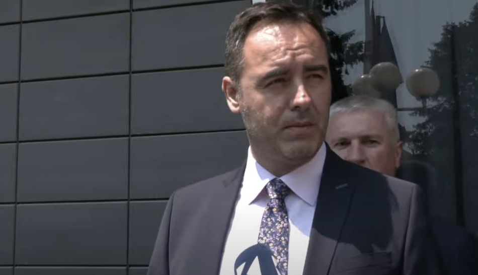 Deputeti Glauk Konjufca ka folur para gazetarëve në oborrin e Kuvendit të Kosovës derisa është larguar pas urdhrit të policisë.