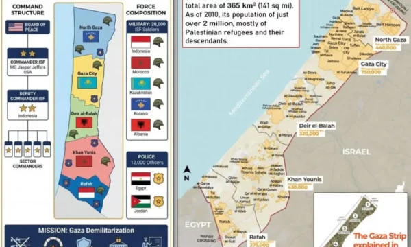 Forca Ndërkombëtare Stabilizuese për Rripin e Gazës pritet të ketë rreth njëzet mijë ushtarë, tete mijë nga të cilët i ka premtuar Indonezia, një gjeneral i të cilit vend do të jetë zëvendëskomandant i kësaj trupe.