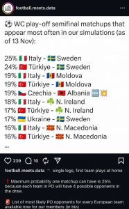 Football Meets Data thekson se asnjë përballje nuk mund të ketë një probabilitet më të lartë se 25%, pasi çdo ekip në play-off do të ketë katër kundërshtarë të mundshëm në short.
