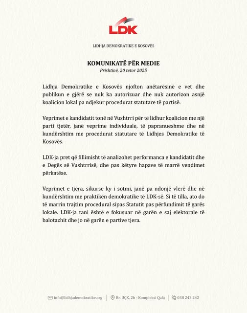 Lidhja Demokratike e Kosovës (LDK) ka dalë me një komunikatë zyrtare për media, duke njoftuar se nuk ka autorizuar dhe as nuk autorizon asnjë koalicion lokal që nuk ndjek procedurat statutare të partisë.