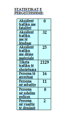 Në raportin e PK-së shtohet edhe se gjatë kohe janë raportuar të kenë ndodhur 32 aksidente trafiku me të lënduar, dhe 25 aksidente me dëme materiale.