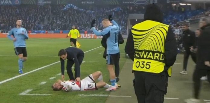 Në pjesën e parë të ndeshjes së Ligës së Konferencës ndaj Slovan Bratislavës, Balliu po tentonte të kapte një top në ajër para pankinës.