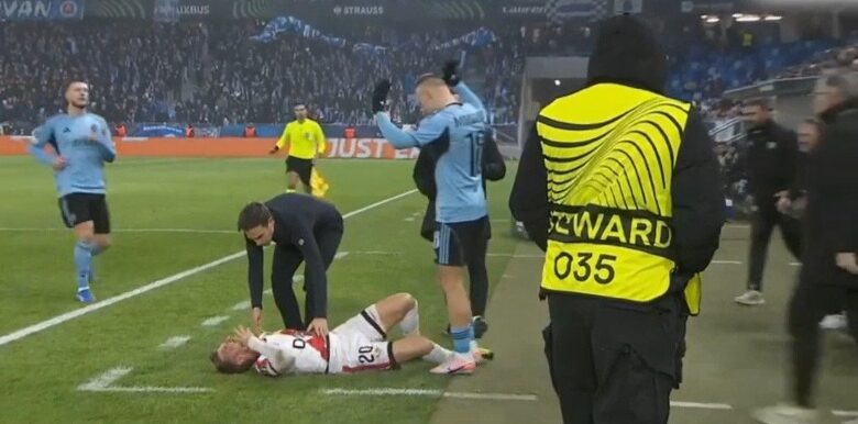 Por ndërhyrja e kundërshtarit bëri që ai të rrotullohej dhe të binte në mënyrë të frikshme me kokë në tokë duke mbetur i palëvizur në anë të fushës.