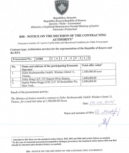 Me kontratë është shpërblyer firma ligjore me bazë në Austri “Zeiler Rechtsanwwlte GmbH”. Kompanitë tjera që ishin ftuar për negocim ishin edhe “Foley Hoag LLP”, me bazë në Boston, e cila kishte ofertuar 1.6 milion euro dhe “Squire Patton Boggs”, me bazë në Neë York, oferta e të cilës kishte qenë 2.4 milionë euro.
