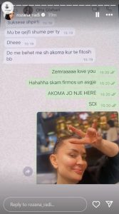 Ndërsa Rozana ia kthen: “Zemra, të dua shumë, hahaha s’kam firmosur unë asgjë, akoma jo një herë s’di”.