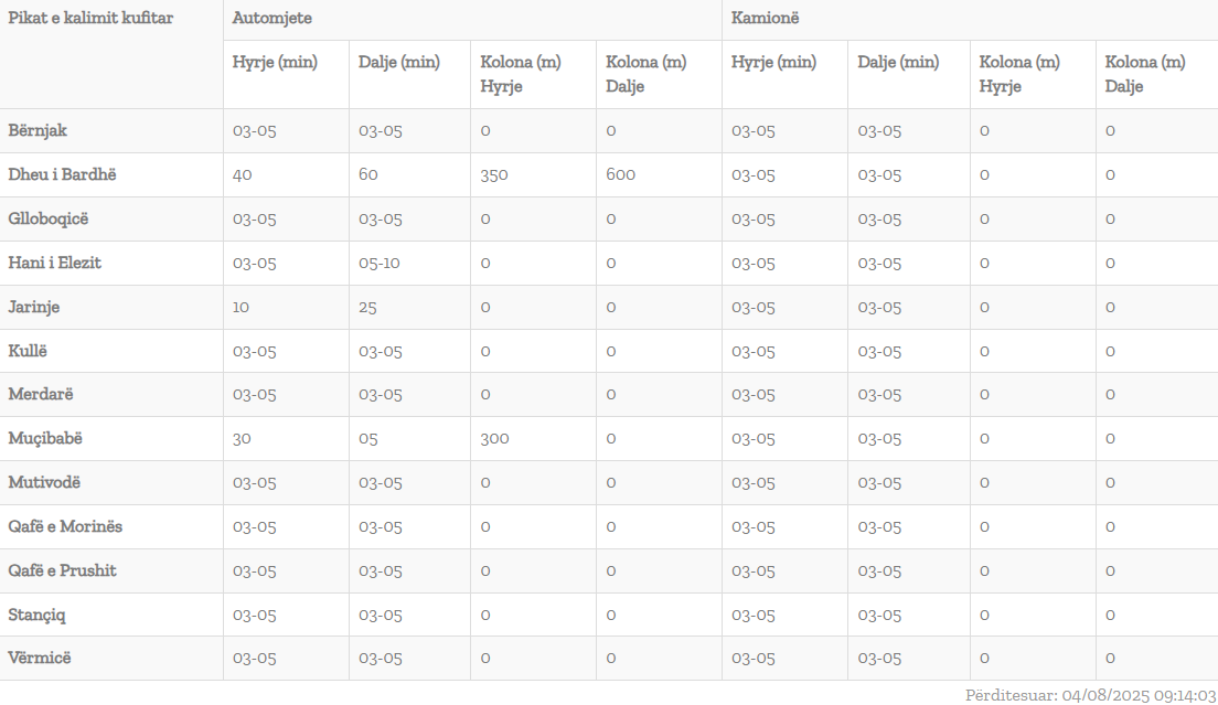 Bazuar në të dhënat e Qendrës Kombëtare për Menaxhim Kufitar, pritjet më të gjata për të hyrë në Kosovë vijojnë deri në pesë minuta.