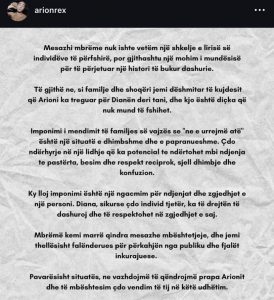 “Të gjithë ne, si familje dhe shoqëri jemi dëshmitar të kujdesit që Arioni ka treguar për Dianën deri tani, dhe kjo është diçka që nuk mund të fshihet. Imponimi i mendimit të familjes së vajzës se “ne e urrejmë atë” është një situatë e dhimbshme dhe e papranueshme. Çdo ndërhyrje në një lidhje që ka potencial te ndërtohet mbi ndjenja te pastërta, besim dhe respekt reciprok, sjell dhimbje dhe konfuzion. Ky lloj imponimi është një ngacmim për ndjenjat dhe zgjedhjet e një personi. Diana, sikurse çdo individ tjetër, ka të drejtën të dashuroj dhe të respektohet në zgjedhjet e saj. Mbrëmë kemi marrë qindra mesazhe mbështetjeje, dhe jemi thellësisht falënderues për përkahjën nga publiku dhe fjalët inkurajuese. Pavarësisht situatës, ne vazhdojmë të qëndrojmë prapa Arionit dhe të mbështesim çdo vendim të tij në këtë udhëtim”, ka përfunduar familja.