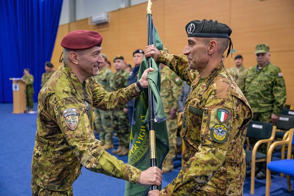 Komandanti në largim, Nënkolonel Giovanni De Santis, ia dorëzoi flamurin e NATO-s Komandantit të ri, Nënkolonel Salvatore Salvaggio – të dy nga Ushtria Italiane 🇮🇹.