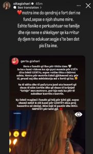 “Hera e fundit që flas për Oltën time. Ja ku e keni videon ku ajo pyet mamin për ETËN (Eta është Gerta), sepse vetëm Olta e thërret ashtu. Motra për motrën është gjithmonë aty për të, pranë saj dhe mbështetja më e fortë që ka.