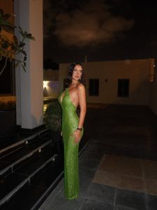 Oriola shfaqet e veshur me një fustan elegant ngjyrë jeshile, që thekson linjat e saj, duke rrezatuar elegancë.