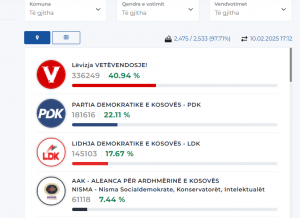Sipas përditësimit të ndodhur në orën 17:12, Lëvizja Vetëvendosje (LVV) ka pësuar një rënie të lehtë dhe ndodhet në 40.94 %, PDK ndodhet në 22.11 %, LDK 17. 67 % dhe AAK-NISMA 7.44 %.