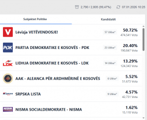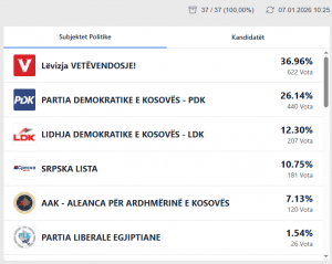 Sipas rezultateve, LVV ka marrë 36.96%, PDK 26.14%, LDK 12.30% dhe AAK 7.13%.