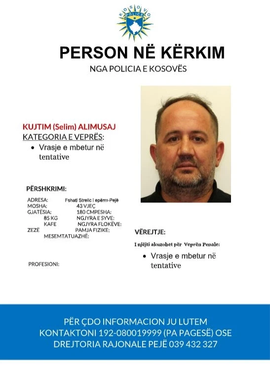 “I pandehuri është i kërkuar për veprat penale ‘Vrasje e mbetur nё tentativё’ Policia e Kosovës kërkon nga qytetarët e Republikës së Kosovës që kushdo që ka informacion për vendndodhjen e personit të dyshuar në foton e bashkangjitur, të lajmërojë Policinë e Kosovës apo të lajmërohet në stacionin më të afërt policor”, thuhet në kërkesën e Policisë.