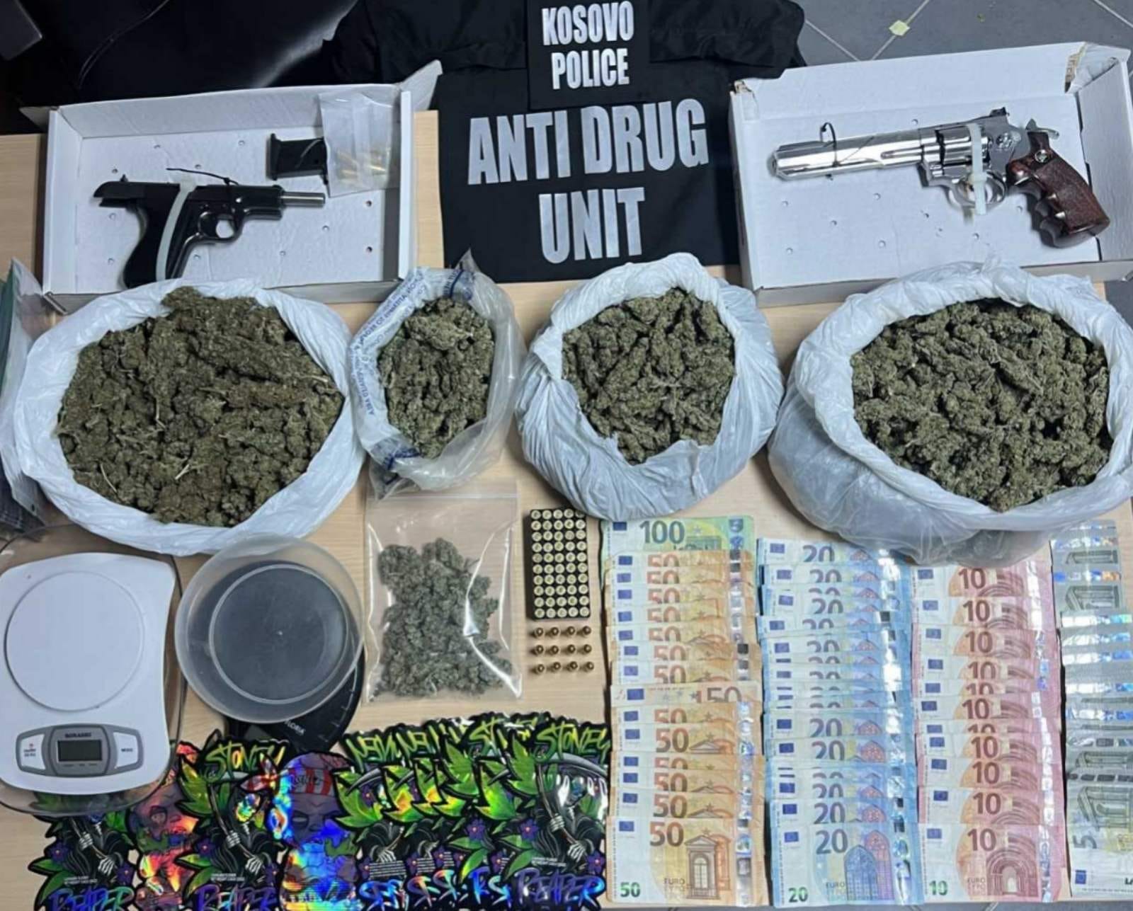 b) Revole Super Sport dhe 12 fishek të kalibrit 9mm, ndërsa i dyshuari L. K. me ti vërejtur policinë ka tentuar të ik nga dritarja me një sasi të narkotikëve në dorë, mirëpo të njëjtin policia e kanë ndaluar dhe arrestuar. Gjatë bastisjes në shtëpinë e tij në pjesë të ndryshme janë gjetur 5 qese të mbushura me substancë të dyshuar narkotike e llojit Marihuanë me peshë të përgjithshme 1503.3 gram, (1 kilogram e 503.3 gram ) dy peshore digjitale që shërbejnë për matje të narkotikëve në sasi të vogla, 50 copë fishek me gas të kalibrit 9mm dhe 1695 euro në bankënota të ndryshme të cilat dyshohet se janë përfituar nga shitja e narkotikëve.