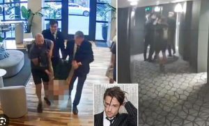 Në pamjet e publikuara nga DailyMail shihet duke u transportuar nga tre burra nëpër hollin e hotelit, disa minuta para rënies fatale nga një ballkon në katin e tretë.