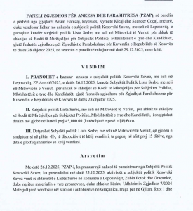 “PRANOHET e bazuar ankesa e subjektit politik Kosovski Savez, me seli në Leposaviq, ZP.Anr.46/2025, e datës 26.12.2025, kundër Subjektit Politik Lista Serbe, me seli në Mitrovicë të Veriut, për shkak të shkeljes së Kodit të Mirësjelljes për Subjektet Politike, Mbështetësit e tyre dhe Kandidatët, gjatë fushatës zgjedhore për Zgjedhjet e Parakohshme për Kuvendin e Republikës së Kosovës të datës 28 dhjetor 2025. Subjekti politik Lista Serbe, me seli në Mitrovicë të Veriut, për shkak të shkeljes së Kodit të Mirësjelljes për Subjektet Politike, Mbështetësit e tyre dhe Kandidatët, shqiptohet dënim me gjobë në lartësi prej 45,000.00 (katërdhjetë e pesë mijë) Euro”, thuhet në vendim.