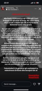 “Mbrëmë u transmetua një video që e vuri Drilonin në një dritë të keqe. Në video duket se ai nuk e ndaloi një mik të tij të bënte komente fyese ndaj grave. Ajo që nuk u tregua në video dhe që duket se është prerë qëllimisht është fakti që Driloni ka thënë qartë se ai dhe Eduardi janë shumë të ndryshëm në këtë drejtim. Ai theksoi se nuk i mbështet aspak këto sjellje dhe kurrë nuk do të luante me ndjenjat e një gruaje. Driloni është dikush që jeton me vlerat e respektit dhe drejtësisë. Ai ka dy motra dhe një nënë dhe nuk do ta pranonte kurrë që dikush t’i trajtonte apo ndonjë grua tjetër pa respekt ose të luante me ndjenjat e tyre. Ky lloj sjellje nuk përputhet me karakterin dhe vlerat e tij. Është e rëndësishme që edhe kjo pjesë e së vërtetës të dalë në dritë. Shpresojmë që kjo deklaratë të merret parasysh në rrjetet sociale ose në emision për të sqaruar situatën”, thuhet në deklaratën e familjes.