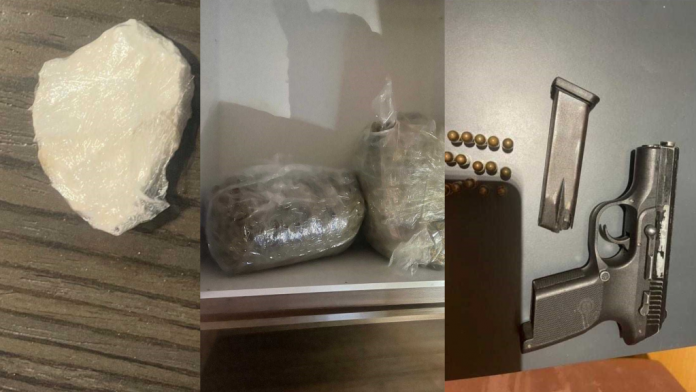 Gjatë kontrollit në shtëpinë e tij janë sekuestruar: 8.560 gramë marihuanë, 5.34 gramë kokainë, një armë zjarri me karikator e 15 fishekë, dy peshore digjitale, para cash (900 euro), gjashtë orë dore, telefona, kartela bankare, pasaportë, DVR, dokumente të ndryshme dhe një veturë.