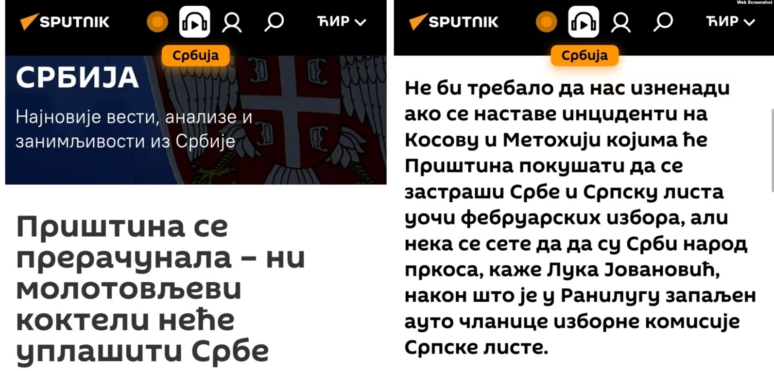 Një shembull është lajmi i Sputnik-ut më 21 janar, në të cilin përfaqësuesja e Ministrisë së Jashtme ruse, Maria Zakharova, pretendon se kryeministri i Kosovës, Albin Kurti, “ka ndërmend t’i falsifikojë zgjedhjet në Kosovë në dëm të Listës Serbe, si dhe të vendosë në vendet parlamentare kukulla besnike të Prishtinës”.