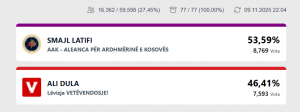 Smajl Latifi i AAK-së ka fituar 53,59% të votave, ndërsa Ali Dula i Lëvizjes Vetëvendosje 46,41%.