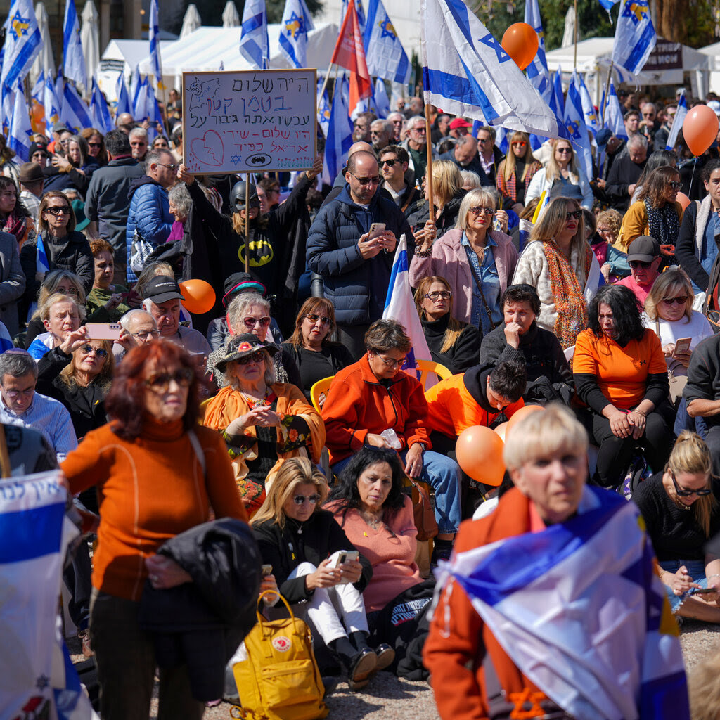 Njerëzit në Sheshin e Pengjeve në Tel Aviv duke parë një transmetim të drejtpërdrejtë të funeralit të Shiri Bibas dhe dy fëmijëve të saj. Ariel Schalit/Associated Press