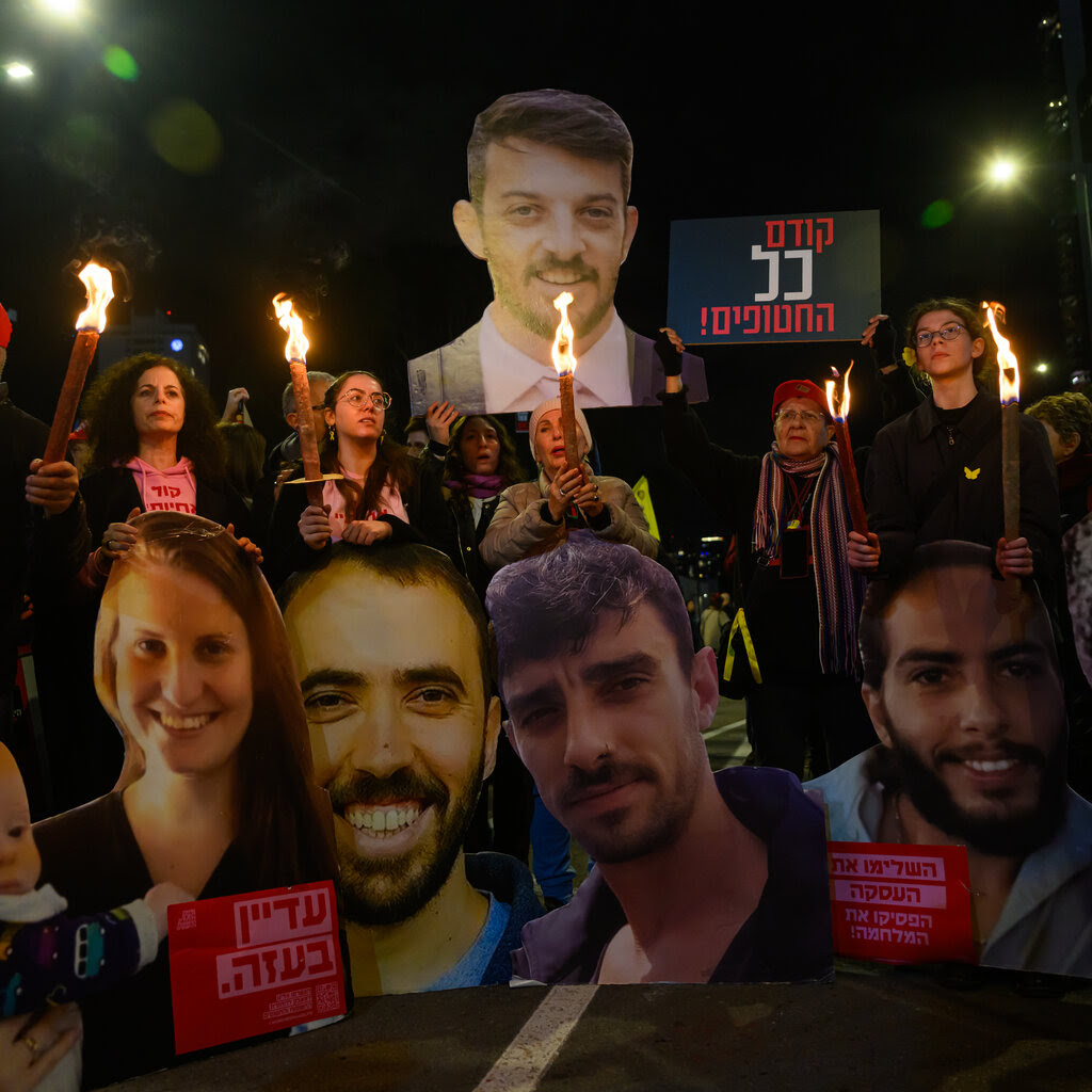 Fotografi të pengjeve të mbajtura në Gaza në një demonstratë në Tel Aviv të shtunën. Aleksi J. Rosenfeld/Getty Images