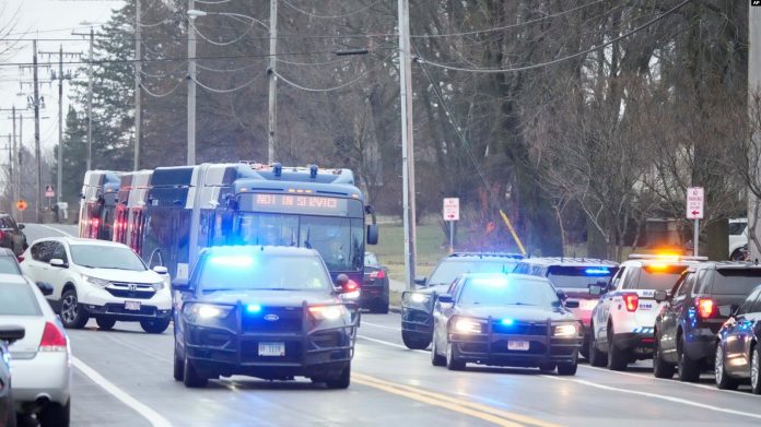 Makinat e ekipeve të emergjencave dhe prindërit përpara shkollës në Madison, Wisconsin